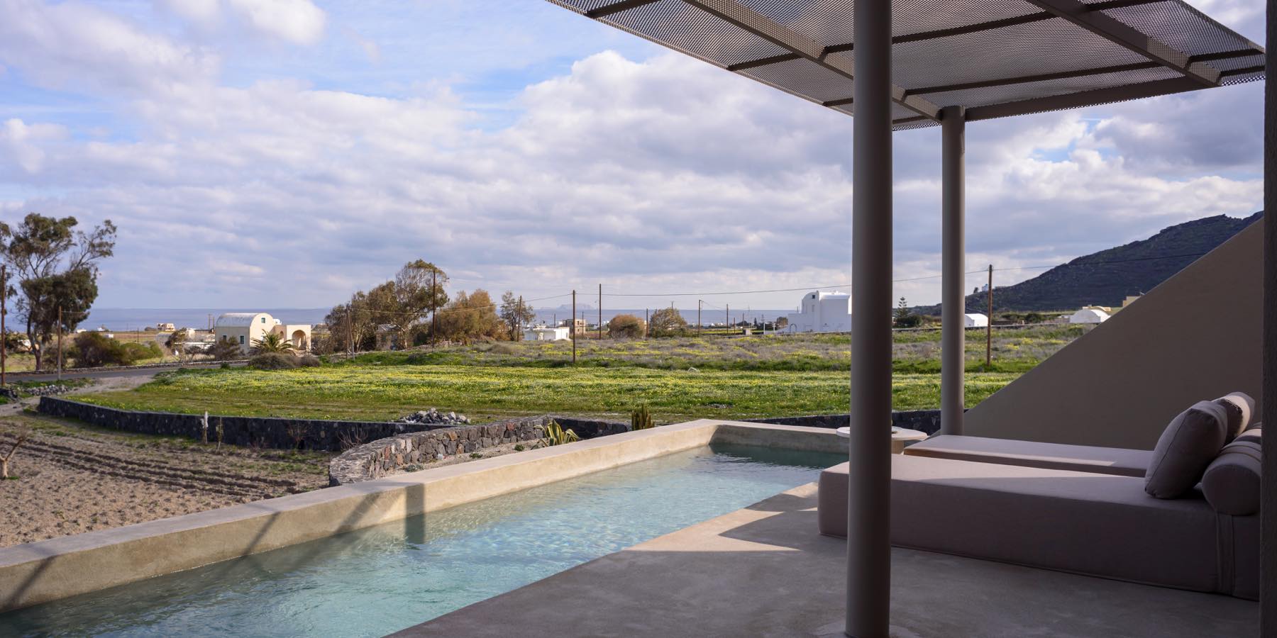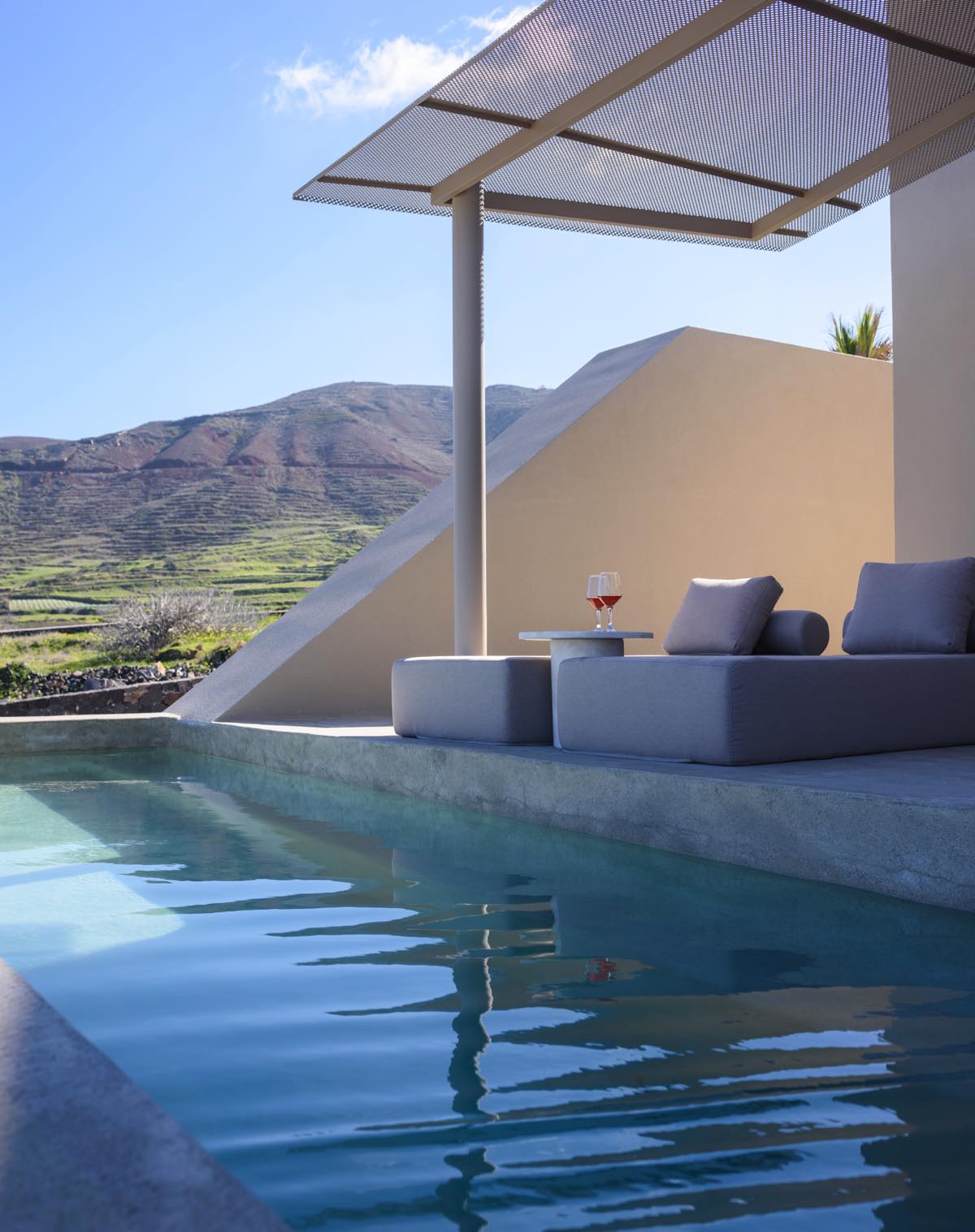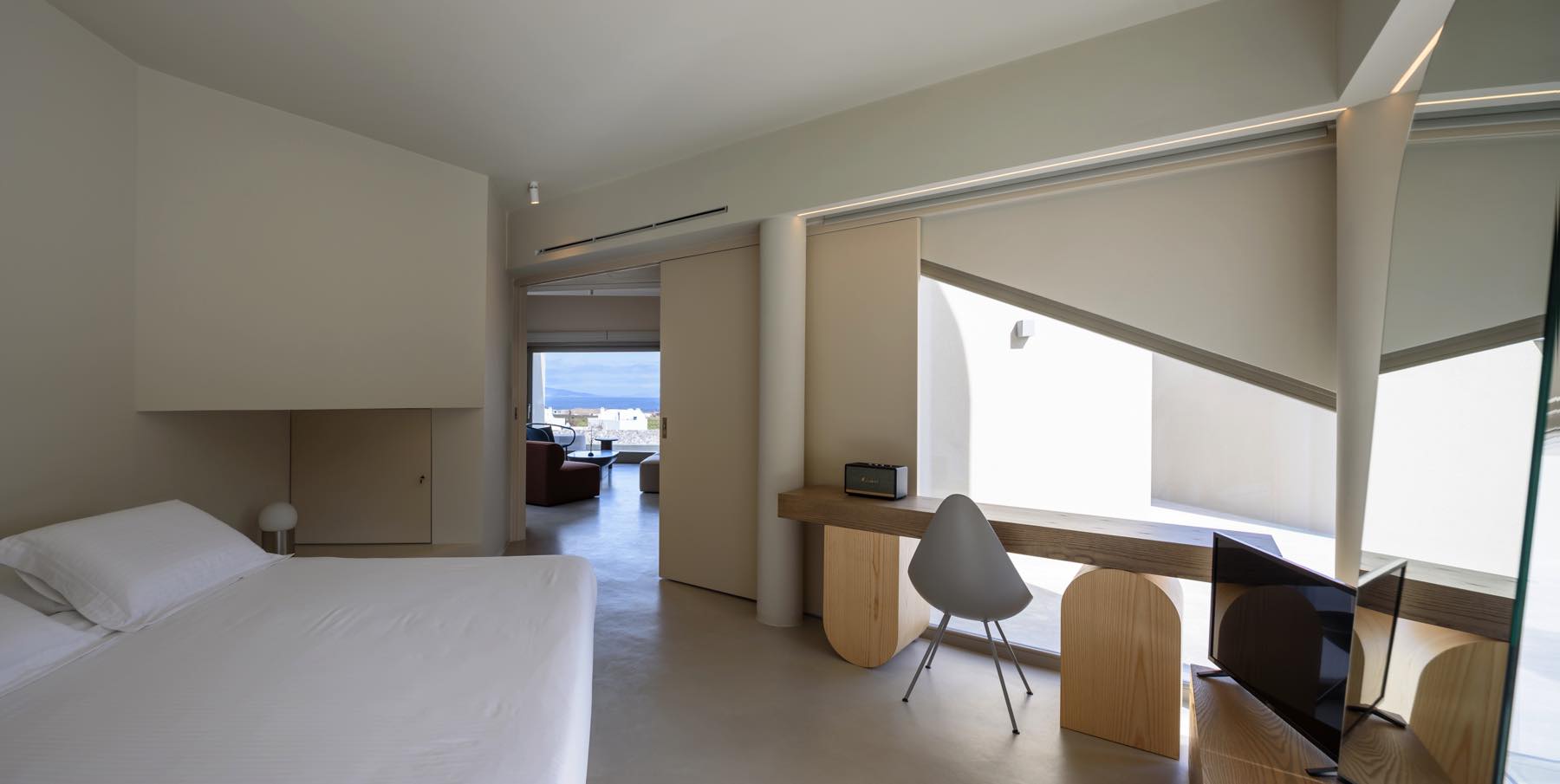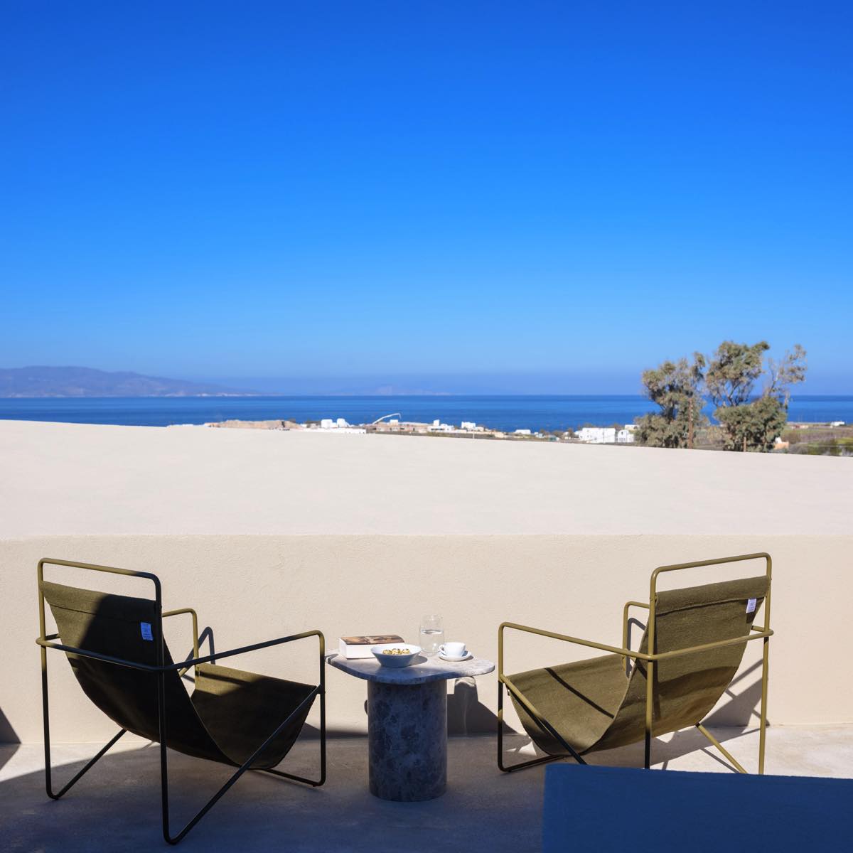 The Azur Suite stuns its guests with its volumes and outdoor grounds with charming views of the sea. The suite offers modern luxury and comfort to a group of up to 4 guests in its 2 stylish double bedrooms. It features 2 bathrooms and a sumptuous living room with a kitchenette. In soothing minimal design, the décor redefines the Cycladic canvas, celebrating pared-down elegance and a breezy feel throughout– a true invitation to leisure and carefree relaxation where contemporary design sets the tone. Rise to gentle mornings and enjoy the landscape of Santorini alfresco in the furnished terrace or the embrace of the gleaming pool. The Azur suite is beckoning you with open arms.